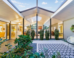 The renovated Masterson home is the true model of an Eichler house. With high arched ceilings and exposed white painted beams, this mid-century modern house is met with retro furnishings and clean lines.